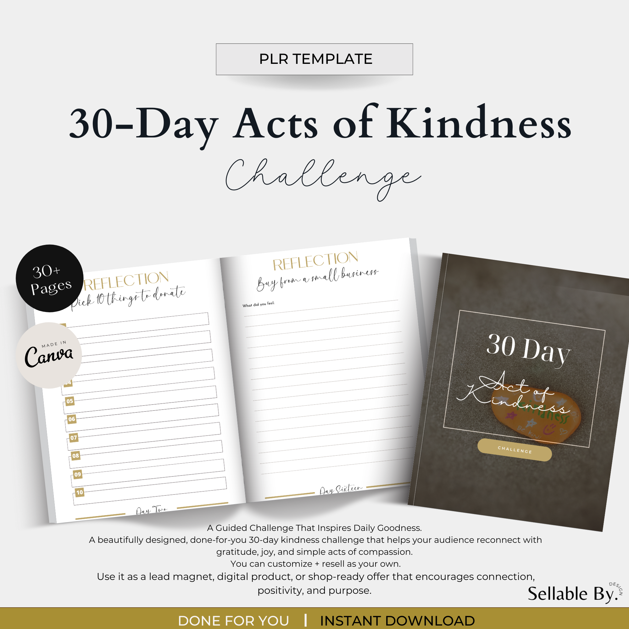 The 30-Day Acts of Kindness Challenge (PLR) is a beautifully designed, ready-to-edit Canva template that helps your audience reconnect with gratitude, compassion, and community through daily acts of kindness.