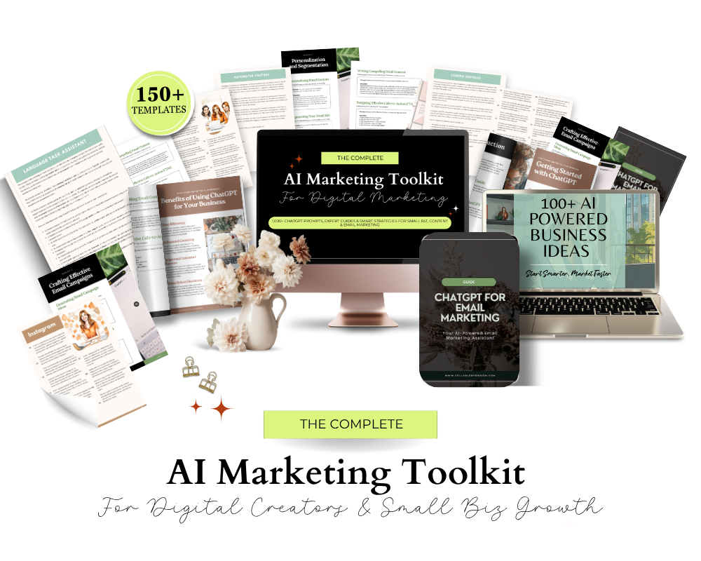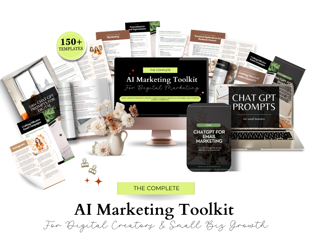 Whether you’re starting from scratch or scaling what you’ve already built, this toolkit will help you, Know exactly what to say in emails, content, and launches, Market smarter (without sounding like a robot), Save literal hours every week, Get fresh ideas on demand even when you feel totally tapped out